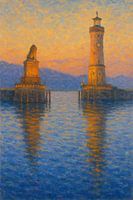 Dit sfeervolle impressionistische schilderij legt de kalme schoonheid van de haven van Lindau vast wanneer de schemering zich over het meer laat zakken. De vuurtoren en het leeuwenstandbeeld staan als twee bewakers van de oeverlijn, zacht oplichtend onder een warm kleurverloop van oranje, perzik en blauw. Het kalme water beneden…