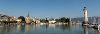 Lindau Bavaria Germany The harbour with its iconic Mangturm lion and lighthouse are reflected in the waters of the harbour.Stitched panoramablue, skies, leuchturm, bayern, lake constance, bodensee, tower,