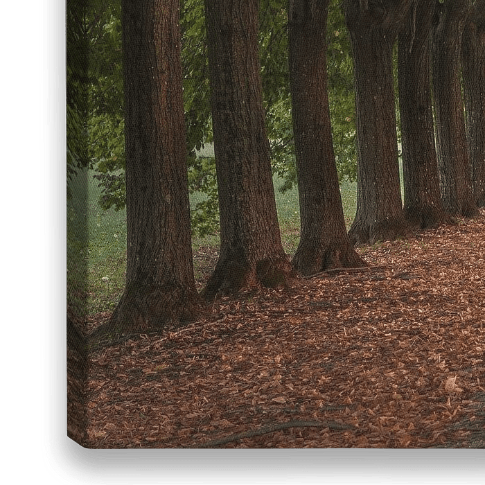 The symmetrical composition draws the viewer's eye down the seemingly endless path, which stretches toward the horizon, framed by the towering trees on either side.