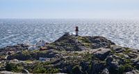 De vuurtoren van Lindesnes op zijn rotspunt bij het zuidelijkste puntje van Noorwegen, op een zonnige maar winderige zomerdag.