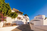 Laan met een restaurant en een kapel in Lindos op het eiland Rhodos, Griekenland.