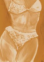 Sexy vrolijk opwindend en warm is dit aarde geel bruine schilderij van een vrouwelijk lichaam in lingerie. We zien haar verleidelijke ronde vormen waarbij ze haar heup net naar voren draait. Kijk je door haar setje heen of is dat je eigen verbeelding… we bekijken haar mooie lijf van de voorkant waarbij ze te zien is vanaf haar borsten…