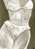 Sexy vrolijk opwindend en optimistisch is dit warm olijf groen wit schilderij van een vrouwelijk lichaam in lingerie. We zien haar verleidelijke ronde vormen waarbij ze haar heup net naar voren draait. Kijk je door haar setje heen of is dat je eigen verbeelding… we bekijken haar mooie lijf van de voorkant waarbij ze te zien is vanaf haar borsten tot aan haar bovenbenen. Wit kant waarmee ze je gaat verleiden. Het origineel heb ik geschilderd in grijstinten, welk ook te koop is in de categorie schilderijen. Deze variant in monochroom neutraal groen wit heb ik digitaal bewerkt tot deze kleurencombinatie en zet ik daarom onder digitale kunst. Meerdere kleuren verkrijgbaar , staat je kleur nog niet online van een van mijn werken? Stuur dan even een berichtje en ik kijk wat ik voor je kan betekenen. Kristakitszart op Instagram.
