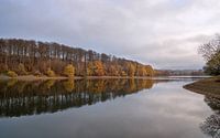 Herfst aan de Lingesetalsperre met heldere kleuren en waterreflectie, Marienheide in het Bergisches Land, Duitsland