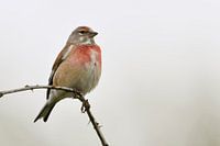 Rode Linnet (Carduelis cannabina), kleurrijke inheemse zangvogel, mannetje, zittend opgezwollen op een bramenstruik, wild, Europa.