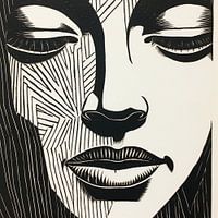 Close op van een vrouw in zwart wit. Het is een lino print. Gemaakt door gutsen in linoleum en dan afdrukken. Mooi gebruik van lijnen en effecten met zwartwit. Passend bij diverse stijlen en trends.