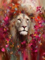 Impressionistisch schilderij van een leeuw in het wild, met bloemen in levendige rode en roze kleuren, kleurrijk en gedetailleerd.