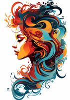 Een vrouwelijk portret met kleurrijke krullen en wervelingen, uitgevoerd in de stijl van vloeiende silhouetten met donker cyaan en oranje tinten. Deze kleurrijke compositie straalt een gepolijste metamorfose uit, gekenmerkt door gedetailleerde composities en een zorgvuldig uitgewerkt karakterontwerp, met levendige kleurcontrasten.