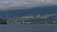Uitzicht over de fjord Burrard Inlet buiten Vancouver, British Columbia, Canada met de beroemde groengekleurde hangbrug Lions Gate Bridge (First Narrows Bridge) die Stanley Park verbindt met de stad North Vancouver op een dag in de herfst met wolken boven de North Shore Mountains.