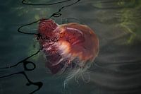 Een Lions Mane Jellyfish zwevend in het water bij de haven. De schaduw van een touw reflecteert als een lijnen spel in het water.