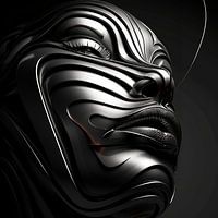Een vrouwelijk gelaat, doordrenkt met de mystiek van afrofuturisme, waar zwarte en zilveren tinten dansen als kosmische partners in dance.