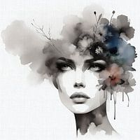 Een portretkunstwerk genaamd Lisa's Flower Fantasy uitgevoerd in pastelkleuren blauw, grijs, koper, brons, bruin, zwart waardoor een prachtig kleurenschema ontstaat. Moderne fantasie kunst.