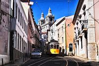 Een karakteristieke oude gele tram in de nauwe straatjes van het Alfama-district in de Portugese hoofdstad Lissabon.