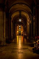 Een leuk doorzicht naar een café-restaurant in de late avond vlak bij één van de karakteristieke pleinen (Praça do Comércio) van Lissabon in Portugal.