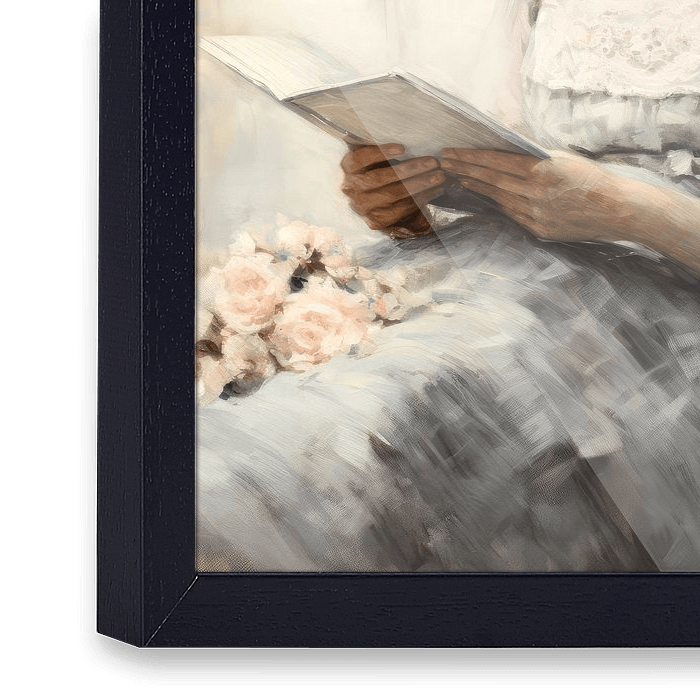 Literary Bliss schildert een serene scène van een vrouw die in een boek duikt, vastgelegd in aquareltinten. Het lichtblauw en pastelkleurig palet geeft een vleugje vintage charme aan dit rustgevende tafereel van lezend genot.
