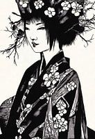 Aquarel illustratie van een jong Geisha meisje in kimono met bloemen in haar haar.