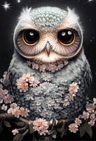 Fantasie portret van een baby uil op een bloesem tak onder een sterrenhemel.