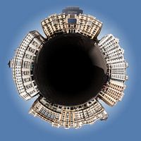 The Gran Via, Madrids Grand Boulevard, as a miniplanet projection. The original panorama (photographer: Victor Lavilla) can be seen here: http://panoramastreetline.com/gran-via-madrid-spanien-P858