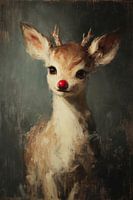 Een portret van een jonge Rudolph het rendier met een opvallende rode neus, geschilderd in een klassieke, melancholische stijl tegen een donkere achtergrond. De zachte penseelstreken creëren een dromerige sfeer, terwijl de grote expressieve ogen en de delicate vormen van het hertje een mengeling van onschuld en mysterie uitstralen. De…