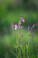 Kleine paarse bloemetjes in een onscherp groen veld. Een fleurig en fris beeld.