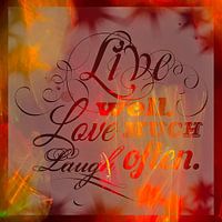 Live well, Love much , Laugh often. Inspirerende tekst op een vurige achtergrond. Wijze uitspraak. Digitale beeldbewerking. Vierkante compositie bestaande uit meerdere lagen.