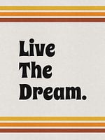 Digitaal kunstwerk met de tekst "Live the dream", met papier achtergrond en warme retro jaren 70 kleuren.