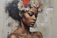 Livia Portret - abstract schilderij / mixed media kunst geschilderd. Mooi contrast tussen het verfijnde portret en rauwe collage/schildertechniek.