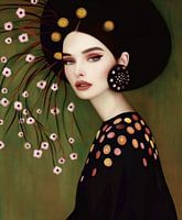 Abstract fantasie portret van een mooie elegante vrouw in voornamelijk groen, goud en pastel tinten