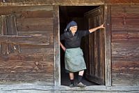 Ljubica vormt een prachtig vitaal contrast met het oude hout. De beweging in het hout komt terug in haar houding. De kleuren van haar rok zijn één met de versleten houten drempels.