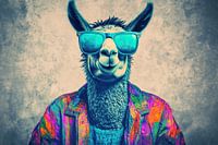 Llama Zonnebril - Op dit dieren schilderij zie je een llama met een stoere uitstraling, die kleurrijke zonnebrillen draagt en is gekleed in een felgekleurde jas, wat het een moderne en speelse vibe geeft.