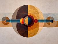 Lobby schilderij - Let op de kleine verrassingen: de dunne verticale en horizontale deling die het doek in vier kwadranten verdeelt, de subtiele booglijnen die de grote cirkel omlijsten, en die kleine, bijna speelse rode accentbolletjes die de symmetrie vriendelijk verstoren. Dat maakt het abstract schilderij interessant op korte…