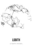 Zwart-witte landkaart, stratenplan of plattegrond van Lobith. Lobith is gelegen in de Achterhoek, in de gemeente Zevenaar, provincie Gelderland. Op de stadskaart zijn alle openbare wegen in Lobith opgenomen. Verder is de kaart voorzien van de coördinaten van het centrum van Lobith.