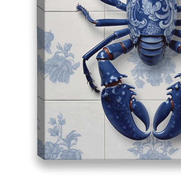 Koop dit stilleven Lobster Luxe - Delfts Blauwe Kreeft Keukentegels van Marianne Ottemann - OTTI op canvas, aluminium dibond, (ingelijste) fotoprint, behang en ArtFrame, op maat geprint in Fine-Art kwaliteit.