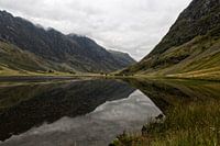 Loch Achtriochtan, Schotland. Bergmeer in de Highlands met laag hangende bewolking.