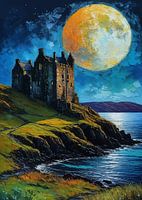 Een sereen landschap van Schotse Hooglanden en het meer van Loch Ness, waar glooiende heuvels bedekt met heide de rand van een rustig meer ontmoeten. De avondmaan komt zachtjes op aan de hemel en werpt een zacht zilveren licht over het kalme water. De oliepasteltechniek voegt rijke texturen toe aan het ruige terrein, met vloeiende overvloeiing voor de zachte gloed van de maan en koelere tinten van de schemering. De stilte van de scène, met het stille meer dat de lucht weerspiegelt, creëert een vredige en tijdloze sfeer in het hart van de Schotse wildernis.