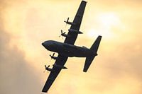 Lockheed C-130 Hercules van de Koninklijke Luchtmacht vliegend in de lucht tijdens zonsondergang nabij het vliegveld Deelen bij het natuurgebied Veluwezoom in Gelderland, Nederland. Het Lockheed C-130 Hercules transportvliegtuig is een Amerikaans viermotorig turboprop militair vliegtuig ontworpen en gebouwd door Lockheed Martin. Deze G-781 (Bob van der Stok) is gestationeerd op vliegveld Eindhoven en neemt deel aan een gezamenlijke oefening van de NAVO op vliegveld Deelen bij Arnhem.