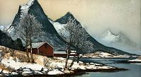 Lofoten, Noors fjordenlandschap in de winter, een hut