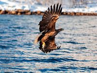 Zeearend (Haliaeetus albicilla) met vers gevangen vis te Lofoten, 2019.