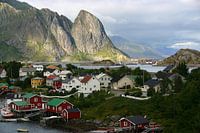 Een typisch beeld van de Lofoten. Houten Noorse huisjes in een omgeving van kale rotsen en water.