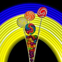 Feestelijke foto van een glas gevuld met smarties en daar 4 mooie kleurrijke lollies in gestoken. Op de achtergrond een mooi kader getekend met licht.