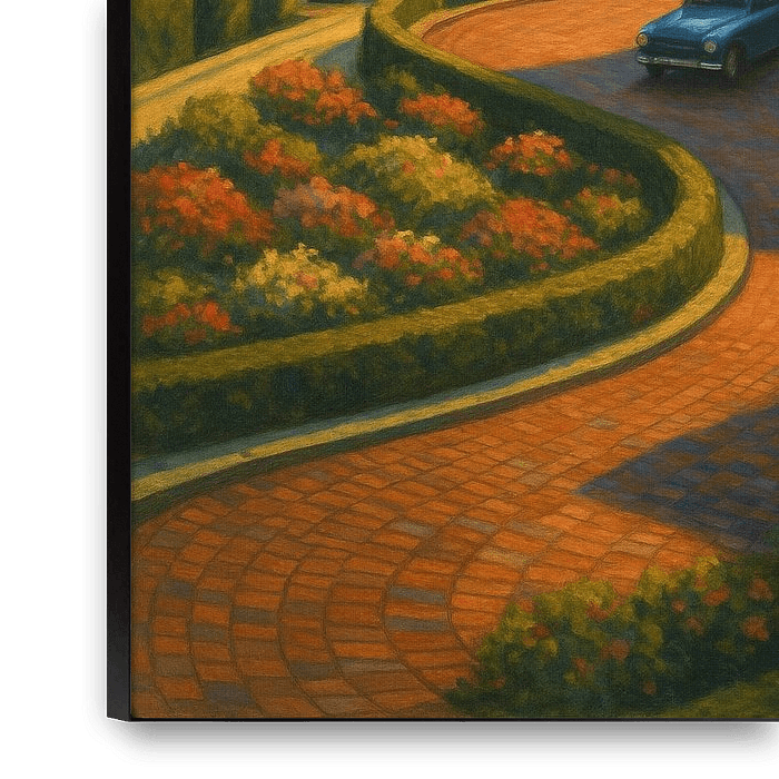 Dit charmante en levendige schilderij vangt de speelse geometrie van Lombard Street, bekend als de "kronkeligste straat ter wereld." De scène toont de beroemde rode bakstenen switchbacks die langs Russian Hill naar beneden kronkelen, geflankeerd door verzorgde hagen en bloeiende hortensia's. De warme, late middagzon benadrukt…
