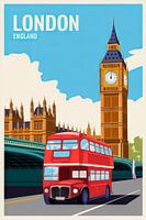 Een rode dubbeldekkerbus rolt bruisend door de straten van Londen, langs de majestueuze Big Ben, wiens iconische klok de hartslag van de stad aan elke bezoeker laat zien. De elegante torens van het Parlement verrijzen op de achtergrond, terwijl de lucht in zachte kleuren straalt en de energie van deze beroemde metropool voelbaar is.
