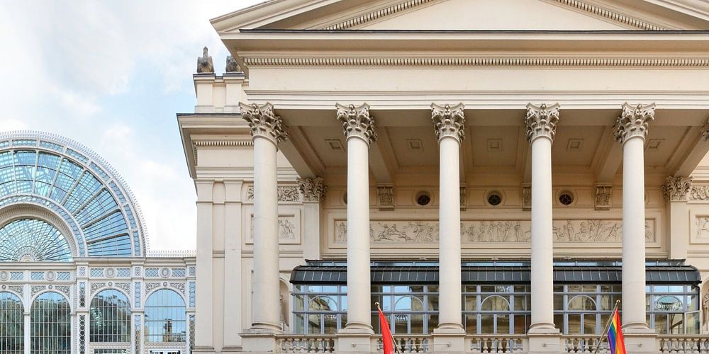 Het Royal Opera House of London ligt in Covent Garden in het Londense West End. Het is een gebouw voor podiumkunsten en huisvest de Royal Opera, het Royal Ballet en het Royal Opera House Orchestra. We bekijken de neoklassieke hoofdportiek van het Opera House en de Paul Hamlin Hall, een constructie van ijzer en glas links van de portiek. De hoofdgevel aan Bow Street werd ontworpen door de hoofdarchitect van het Opera House, Edward Middleton Barry. Het wordt gedomineerd door een neoklassieke portiek die doet denken aan een monumentale Griekse tempel. Het maakt gebruik van Korinthische zuilen en ornamenten in de stijl van de Barok Revival, en bevat ook beelden en reliëfs van het vroegere tweede operagebouw.