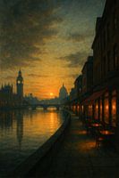 London at Dusk legt de stille grandeur van de Britse hoofdstad vast wanneer het daglicht overgaat in een amberkleurige schemering. De Houses of Parliament en St Paul's Cathedral rijzen op als schildwachten van de geschiedenis, weerspiegeld in het stille water van de Theems. Een rij cafés langs de kade gloeit zacht op, hun interieurs verwijzen naar ongeziene levens en gesprekken.