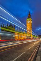 Deze foto van de Big Ben en het Palace of Westminster heb ik gemaakt tijdens een mooi blauw uurtje in april 2016. De lichtstrepen zijn van een typische Londense Bus.