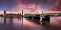 Fulminante zonsondergang bij de Westminster Bridge in het centrum van Londen in Engeland / Groot-Brittannië. Aan de overkant ziet u het Palace of Westminster en de Big Ben, een van de monumenten van Londen. De brug leidt over de Theems, die de kleuren van de lucht vanavond prachtig weerspiegelde.