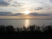 Zeilboot ind everte bij zonsondergang in de haven van lelystad. De Marina Haven langs de dijk.