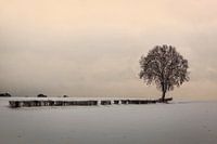 Minimalistisch beeld van een enkele boom op een met sneeuw bedekte akker tussen Berghöf en het Gerendal in Zuid-Limburg.
