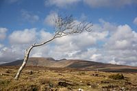 Een eenzame boom, gebogen door de wind in de bergen van National Park Ballycroy, county Mayo in Ierland.