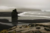 Een eenzame rots op het strand van Dyrholaey, IJsland. Het zwarte zand is een sterk contrast met het witte water van de oceaan.